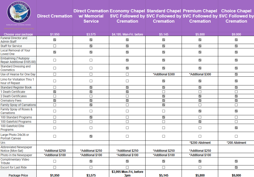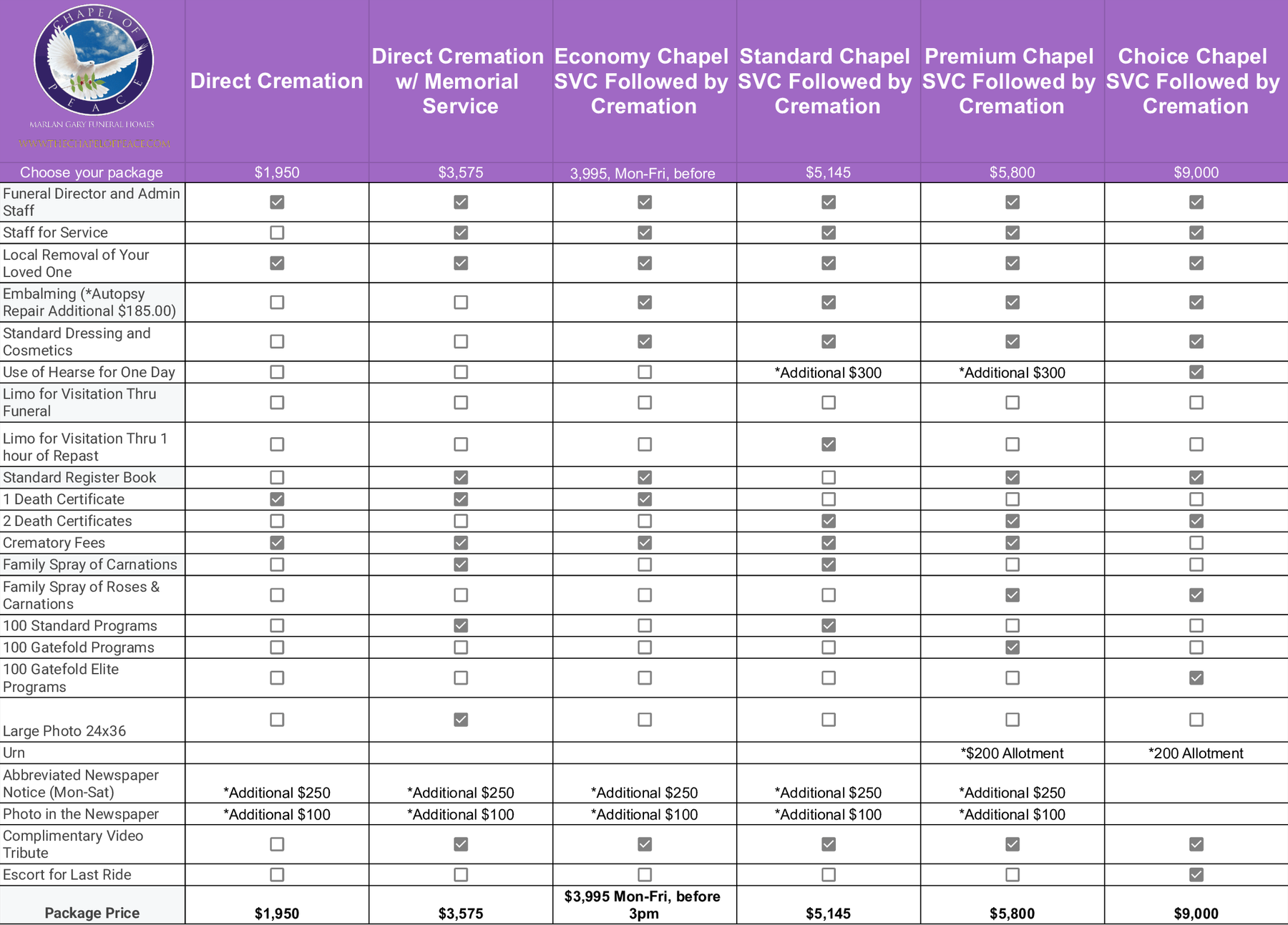 The prices displayed on this page are discounted from our regular rates, packaged to offer you the essential items and services for a complete cremation service. If you prefer a more personalized approach, you have the option to select services individually from our general price list. Please note that substitutions are not allowed on the packages, except for external charges. In the event you purchase a casket from another vendor, these packages won't be available, and you can choose services individually from the general price list. At Marlan Gary Funeral Homes, our goal is to support you with transparency, empathy, and integrity throughout the process.